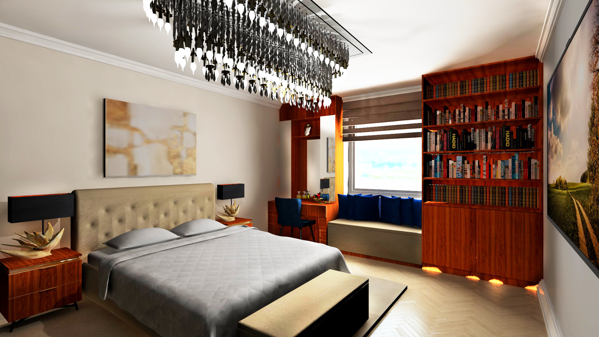 A hálószobában fényes bútorlapból készített, méretre gyártott bútorok biztosítják a házaspár kényelmét, a tükrökkel megnövelve a szoba méretének érzetét. A kényelmes olvasópad, a fésülködőasztal beépítése egyszerre funkcionális és melegséget sugárzóan otthonos.